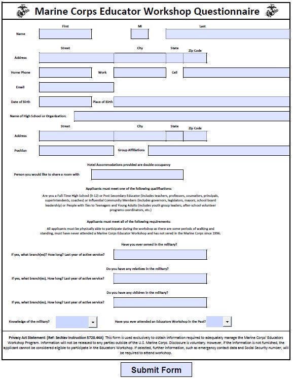 The Educator Workshop is one of the premier community engagement initiatives in the Marine Corps. Its purpose is to provide educators and other community influencers the opportunity to gain first-hand experience on how the Marine Corps transforms young men and women into U.S. Marines. These workshops also provides attendees with current information regarding Marine Corps recruit training and officer candidate school training practices and procedures, military job skills and opportunities, military lifestyle, and educational benefits available to Marines. The intent of the program is to demystify the recruit and officer training experiences and foster closer relationships between Recruiting Station personnel and those in their communities who have influence on the decisions of young men and women. If you are an educator or an influencer and would like the opportunity to attend an Educators Workshop, please click on the form below!